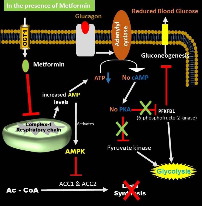 Overall, the administration of metformin in diabetic patients lowers gluconeogenesis, reduces lipid biosynthesis, increases glycolysis, and promotes weight loss.