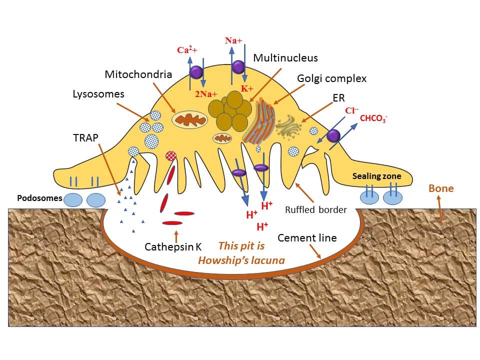 As mentioned above, osteoclast is a bone cell and is present in pits of the bone surface, which are called resorption bays or Howship’s lacunae. It contains homogeneous cytoplasm with a foamy appearance. This foamy character of the cytoplasm is due to the presence of more amount of vesicles and vacuoles. The vacuoles such as lysosomes are filled with the enzyme, acid phosphatase. The acid nature of osteoblast cells allows researchers to identify these cells through the staining method. The staining method also gives information on how much amount of tartrate-resistant acid phosphatase (TRAP) and cathepsin K are present in the osteoclast cells. Moreover, osteoclasts contain more amount of thin rough endoplasmic reticulum and an extensive Golgi complex.