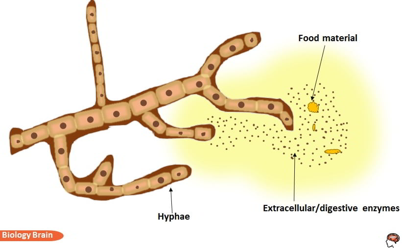 - The mycelium’s substantial surface area allows fungi to absorb the smaller molecules generated by extracellular digestion by exoenzymes like hydrolases, transferase, lyases, oxidoreductase, etc