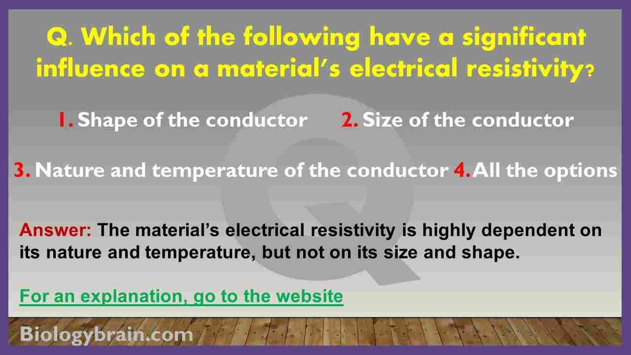 Explanation: The material’s electrical resistivity is highly dependent on its nature and temperature, but not on its size and shape. The materials or substances that show less resistivity are called good conductors, while the substances that have higher resistivity are called bad conductors or insulators. The resistivity of semi-conductors falls between the resistivity of good conductors and nonconductors (insulators).
