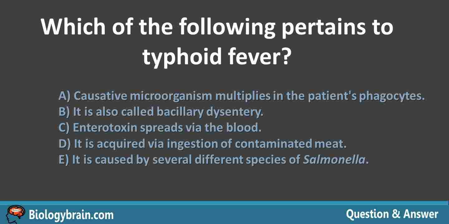 Explanation: The causative agent of typhoid fever is only Salmonella enterica, a gram-negative bacterium that multiplies in the phagocytes of infected patients. The toxin produced from these bacteria is strictly localized in specific organs of the body especially the spleen and brain but not in the endothelium of blood vessels of other organs (e.g. lung, liver, and kidney). Typhoid fever easily spreads through contaminated water and food but not through contaminated meat. Lastly, bacillary dysentery is a type of dysentery caused by Shigella species but it is not caused by Salmonella spp.